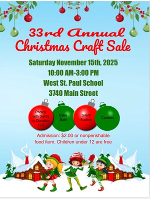 - West St. Paul School 33rd Christmas Craft & Bake Sale: November 15, 2025 - 10:00 am - 3:00 pm